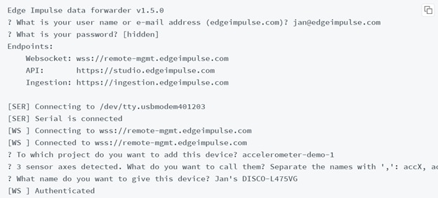 Figure 8: Configuring the Edge Impulse data forwarder (Source: Edge