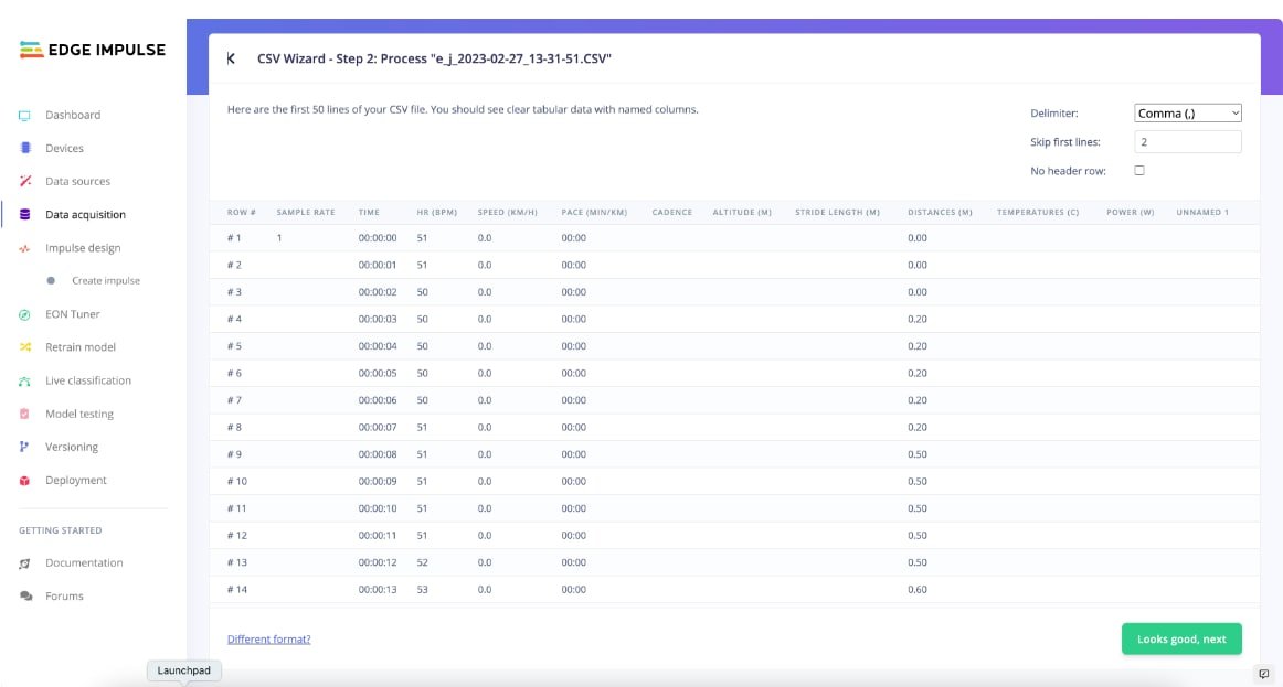• The final tool is Uploader. This tool is available both via a CLI tool and the browser. It accepts .wav audio files and .jpg image files, and .cbor and .json structured data file formats that are useful for most other sensor data. This is a convenient way to allow developers to collect data however they see fit before ingesting the data set with a simple click of the mouse. Edge Impulse recommends this method as a way to migrate data between different Edge Impulse instances. A data acquisition format is prescribed for the .cbor and .json files can be found here.