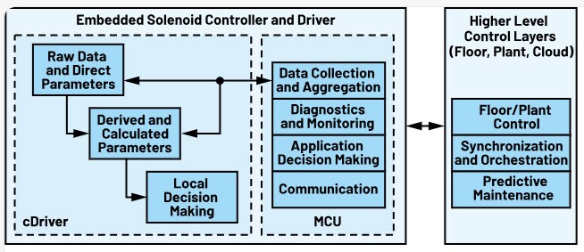 The latest silicon cDriver™ solutions, which consist of a smart controller and driver, enable intelligent actuators at the edge by merging sensor and actuator functions into single integrated components to be used inside embedded motion control solutions.[2] System parameters and state variables that are only available directly in or at the electromechanical actuator are measured and evaluated in place (for example, temperature, solenoid reaction time, and motor load value).