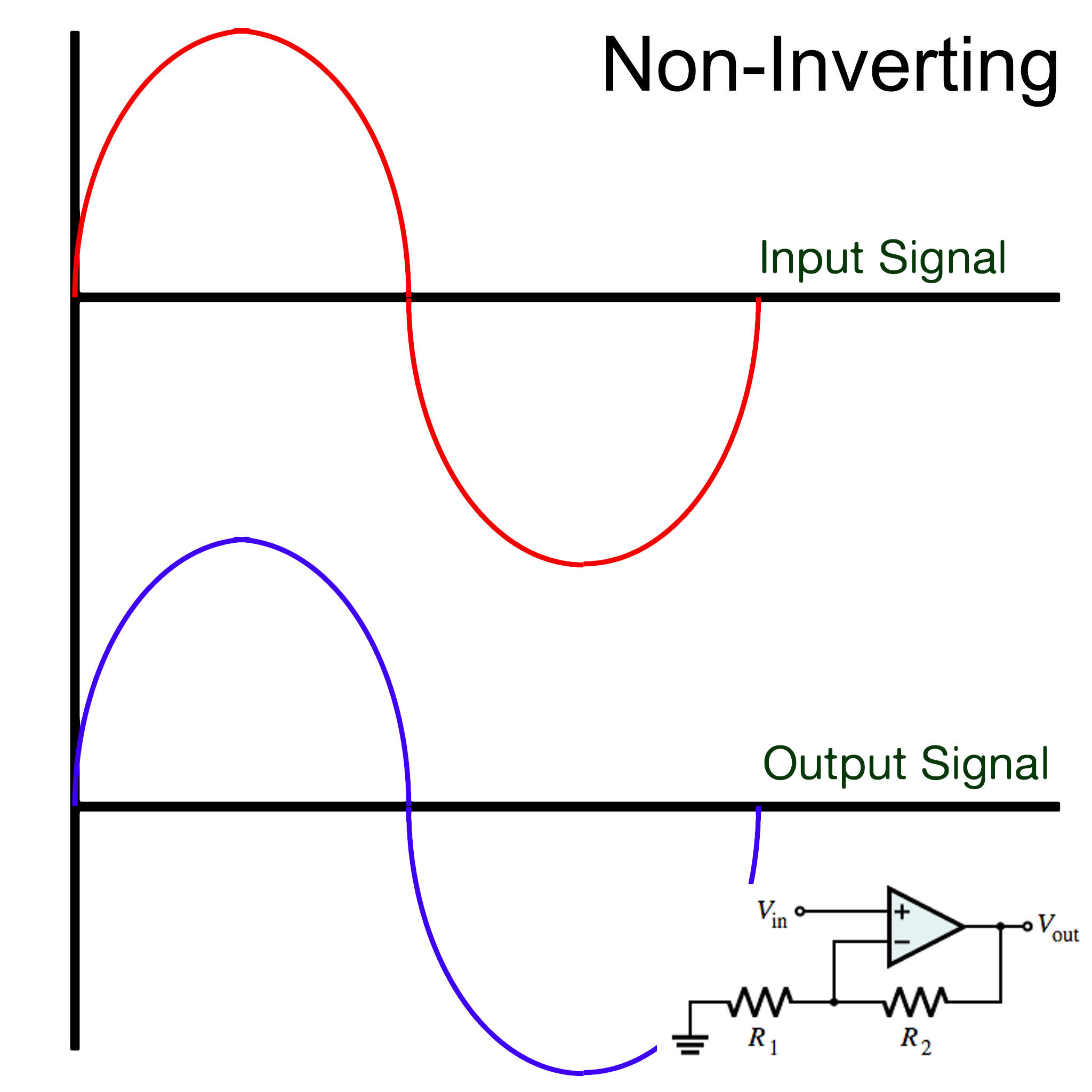 Two basic op amp configurations are known as “non-inverting amplifier” and “inverting amplifier”. The output of the non-inverting amplifier will remain in phase with the input signal, while the output of the inverting amplifier is 180-degrees out of phase. Both configurations take advantage of a design technique known as “negative feedback” which take the output signal and through a resistor network feeds it back into the inverting input. This is what allows amplification to occur. The non-inverting configuration feeds the input signal into the non-inverting (+) input of the op amp. Conversely, with an inverting configuration, the signal is fed in through the inverting (-) terminal.