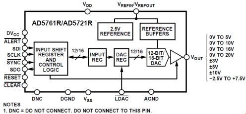 Analog Devices AD5761/R 16-bit multiple range voltage output digital-to-analog converters (DACs) operate from single supply voltages of 4.75V-30V or dual supply voltages of -16.5V to 0V VSS and 4.75V-16.5V VDD. With its integrated output amplifier, reference buffer, and power-up/power-down control circuitry, the single-channel AD5761/R DACs provide an easy-to-use, universal solution.Compatible with DSP and microcontroller interface standards, AD5761/R's serial interface operates at clock rates of up to 50MHz. Double buffering enables the asynchronous updating of the DAC output. User-selectable functions include twos complement or straight binary input coding and output range via the RA[2:0] bits in the control register. Eight software-programmable output ranges are available including 0V to 5V, 0V to 10V, 0V to 16V, 0V to 20V, ±3V, ±5V, ±10V, −2.5V to +7.5V with 5% over range. The AD5761R version provides a typical low drift 2.5V reference of ±2ppm/°C. AD5761/R DACs deliver guaranteed monotonicity, integral nonlinearity (INL) of ±2LSB maximum, 35nV/√Hz noise, and 7.5μs settling time on selected ranges.