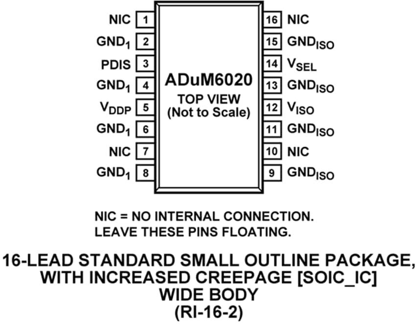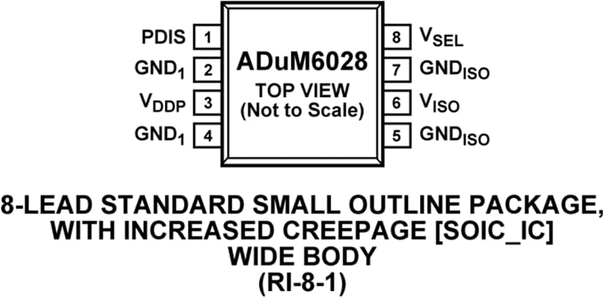 The ADuM6020 and ADuM6028 are available in two different package variants. The ADuM6020 is offered in a wide-body, 16-lead SOIC_W package, and the ADuM6028 is offered in a compact 8-lead, wide-body SOIC_IC.